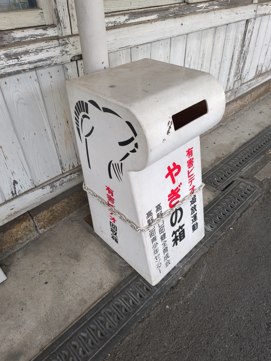 高野口駅。有害ビデオっていつの話だ。VHSビデオを入れろってことかな。もう撤去してもいいのでは。今はDVDさえ見ない。
