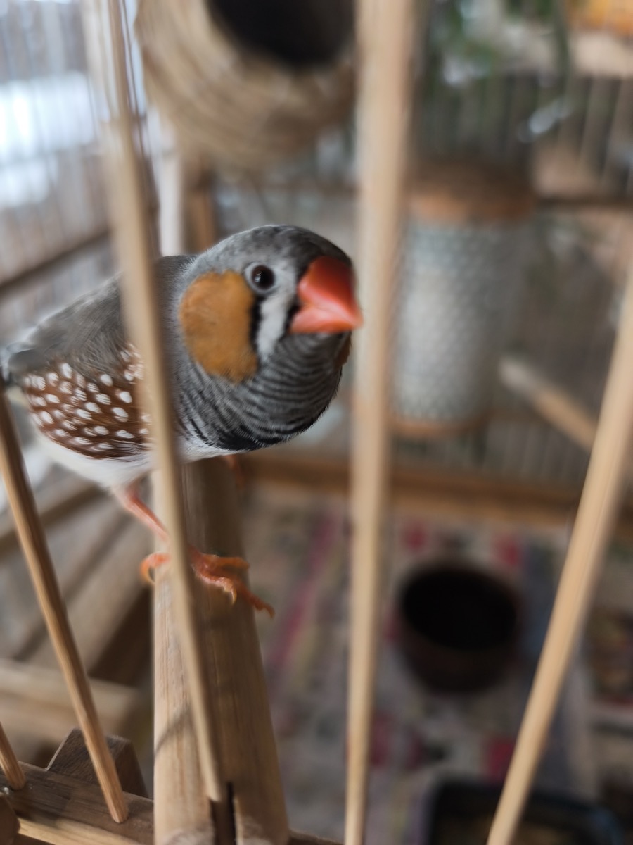 店長で金太郎という名前のキンカチョウという種類の鳥がお出迎え。