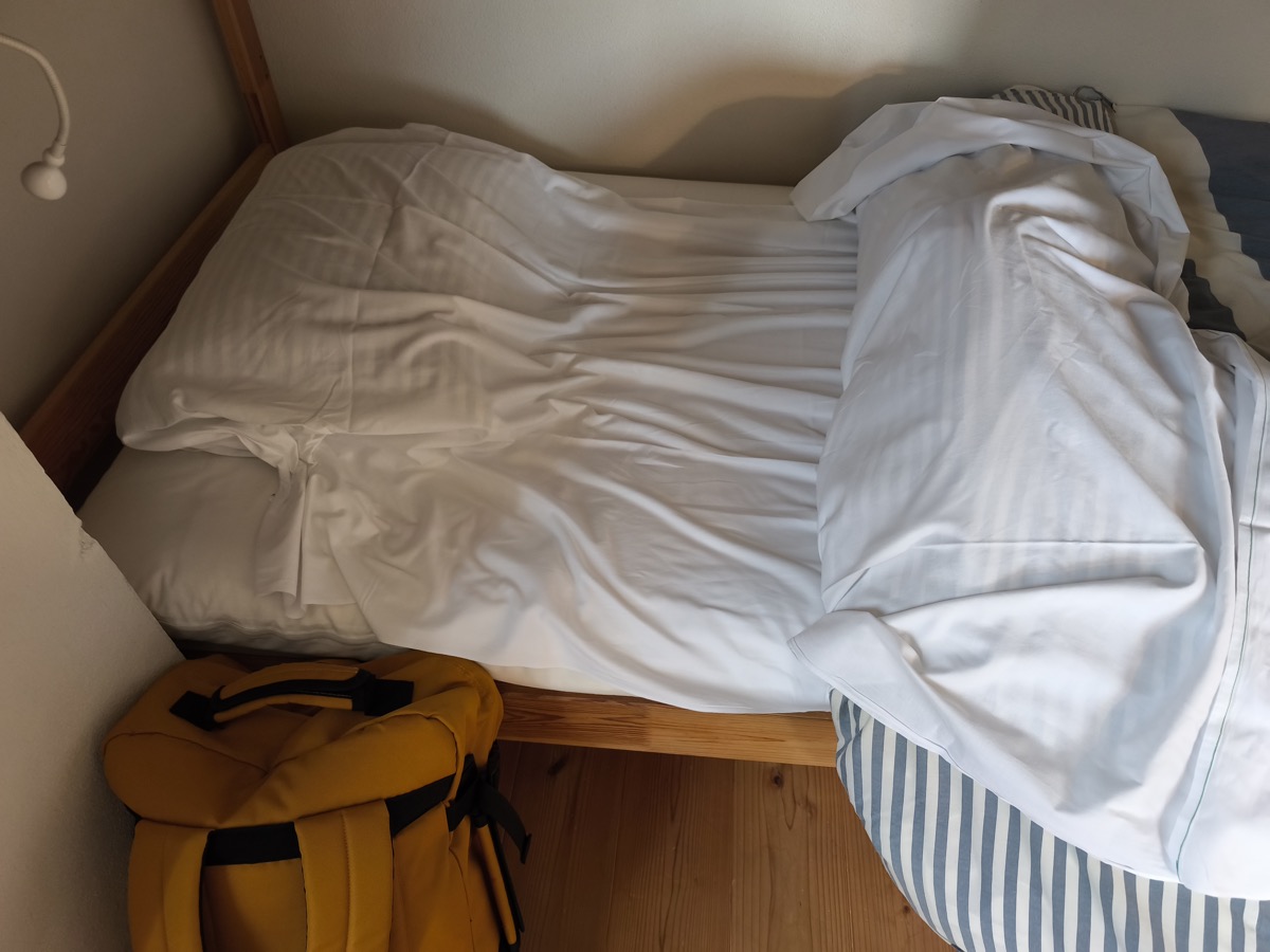 ここのシステムがナイスアイデアで、たたまれたシーツ2枚があり、このように、シーツにはさまる形に寝てくれと言われる。だから枕の上にシーツをかける。チェックアウトの時には、使い終わったシーツ置き場に入れてくれと。