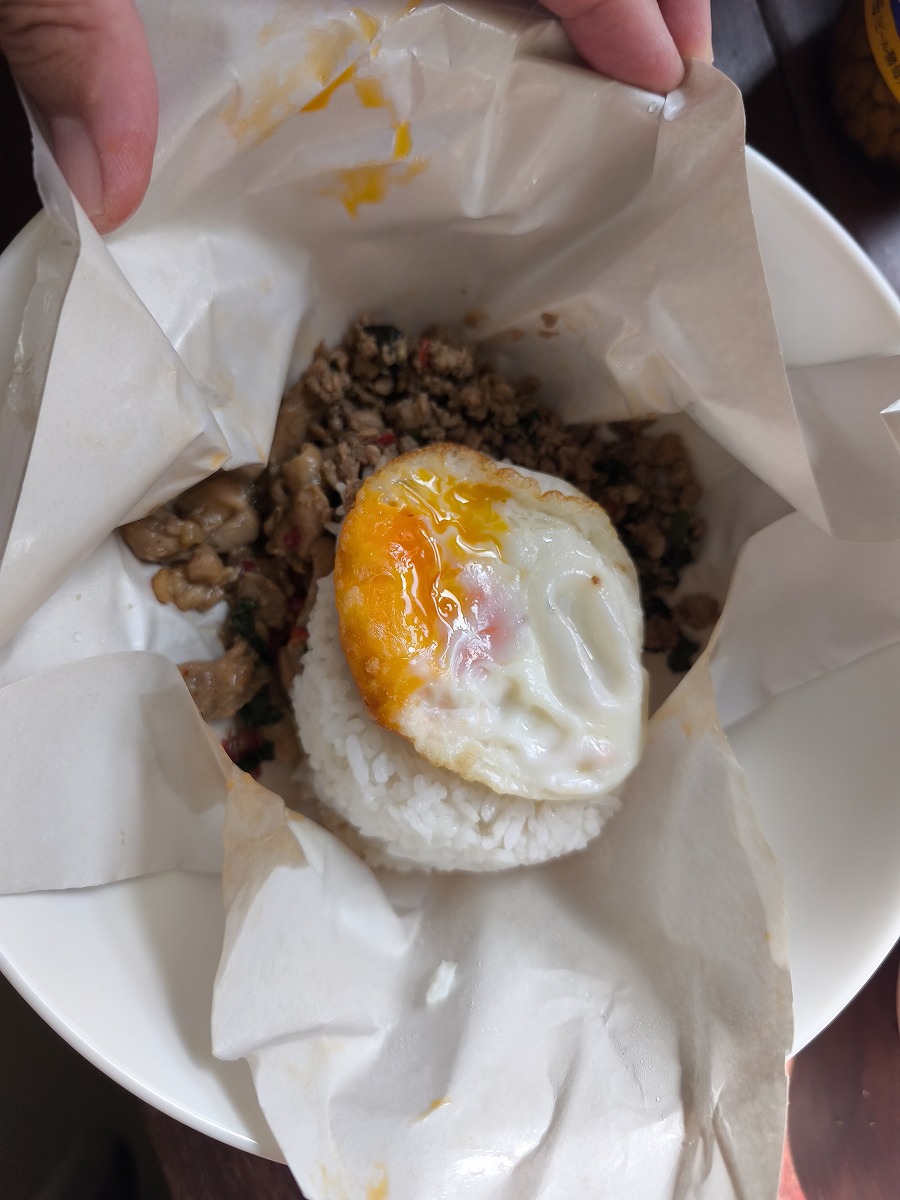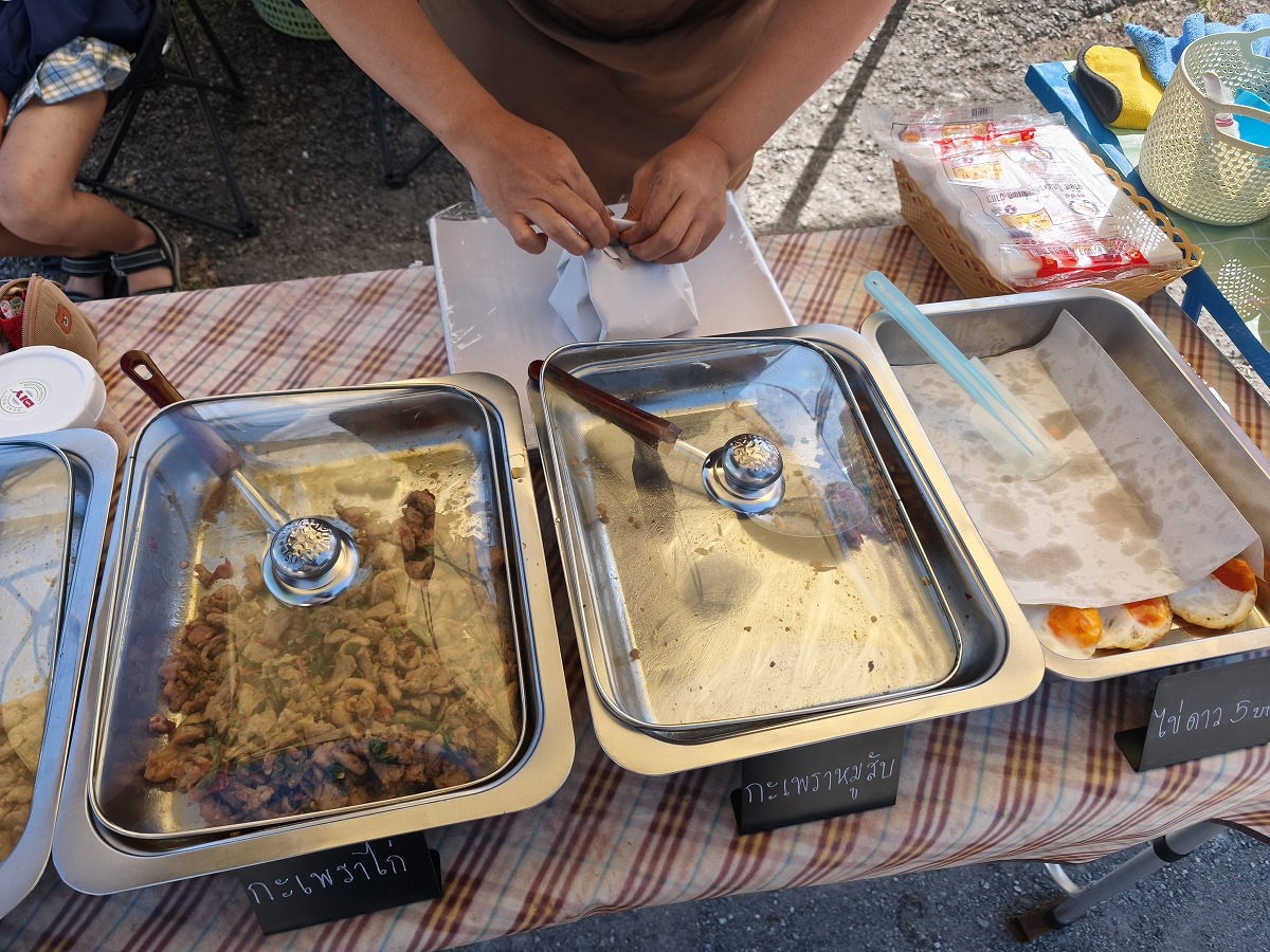 線路沿いに朝だけオープンしているガパオライス店があるのですが、行きは開いていて、帰りはしまっている。今日はたまたま売れ残っていたようで買うことができました。