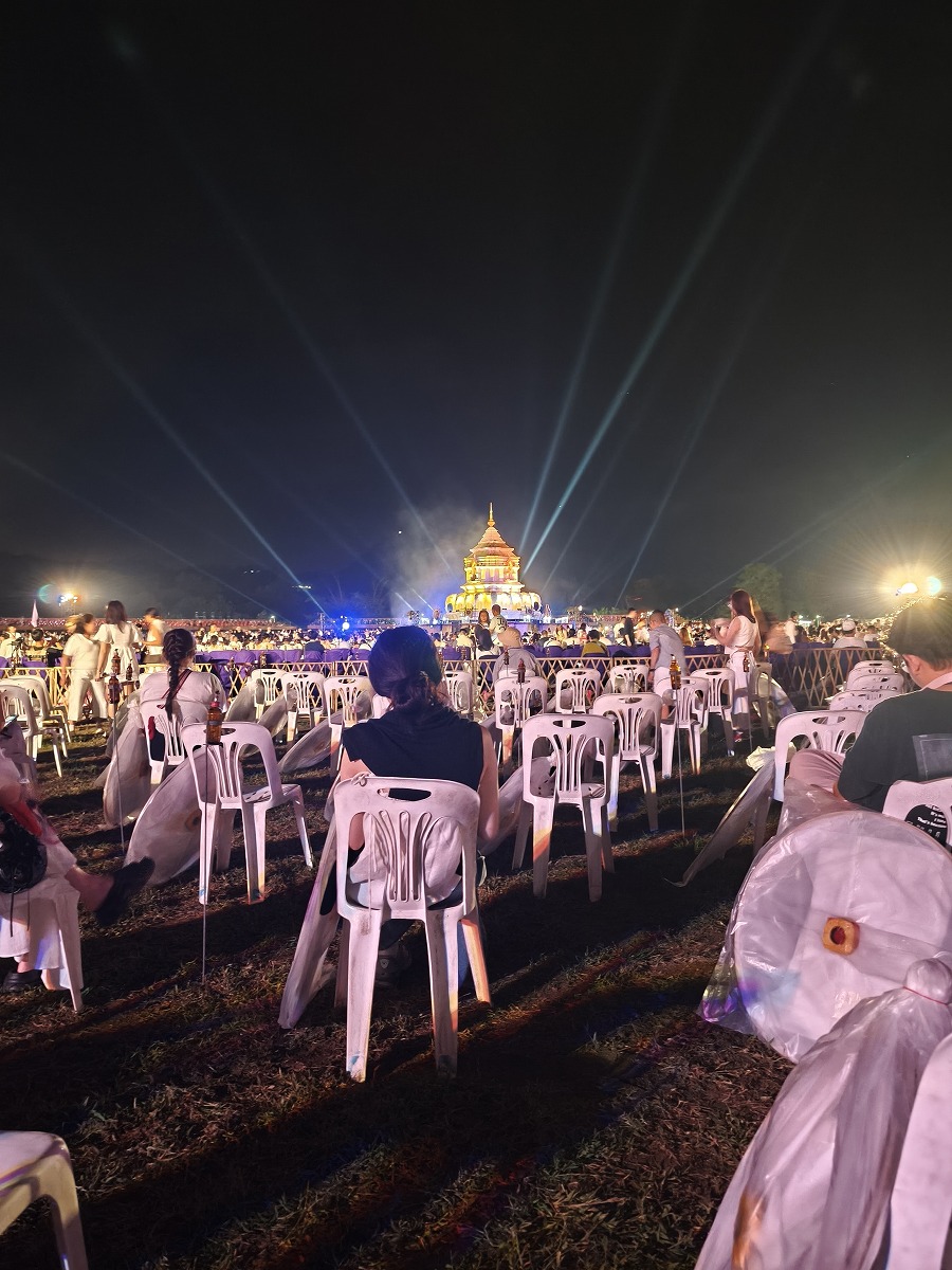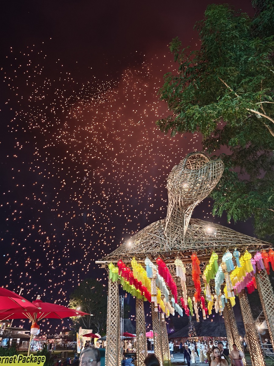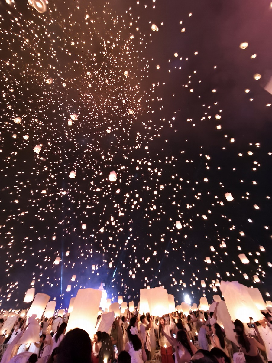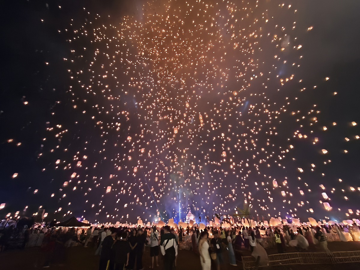 チェンマイではこういう有料なところが3個所が開催されるらしいが、ここが一番人が多いらしいのでこの景観。白いランタンが炎に染まるのが良いのだろう。