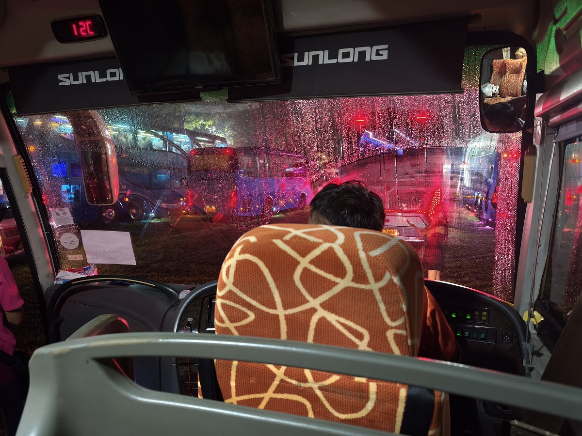 バスに乗ると同時に雨が。帰る人たち、みんな大変なことになっている。