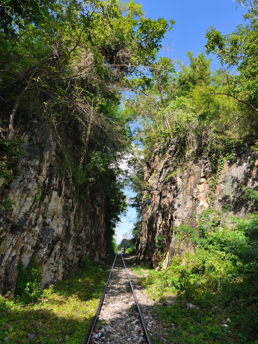 チョンカイの切通しとは、タイとミャンマーを結ぶ「泰緬鉄道」の一部で、第二次世界大戦中に旧日本軍が建設した、高さ約30mの岩山を削り取って線路を敷設した場所です。列車のすぐ横が崖になっており、迫力ある景観が楽しめることで人気があります。