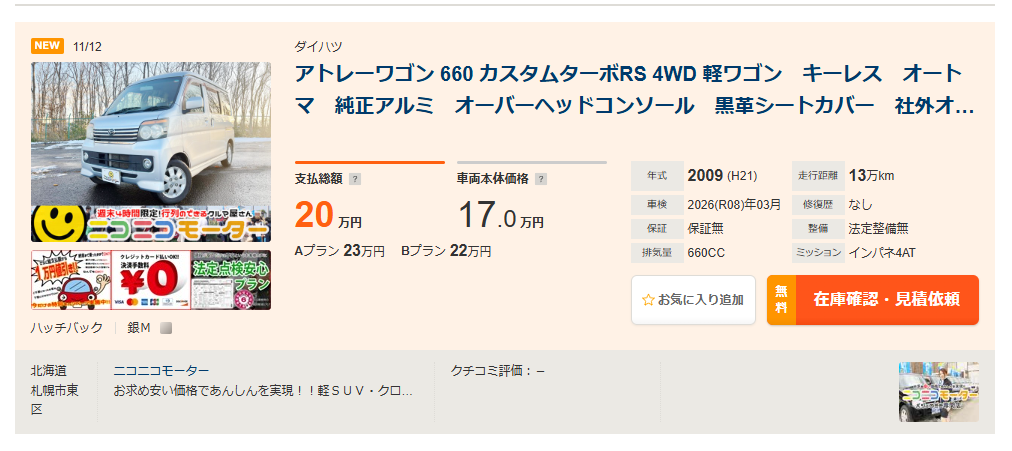 軽バンが1ヶ月36,000円。保険をつけるとどうなるか気になるが。