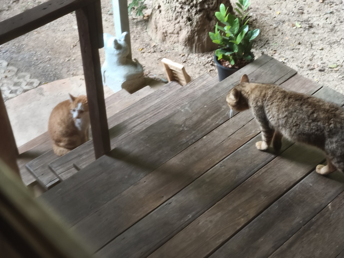 先日、この2頭が喧嘩して、おそらく右の子が勝ち、うちに居座るようになりました。