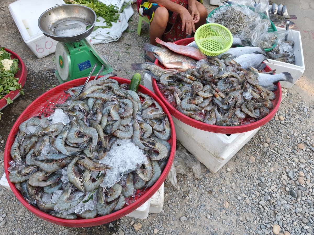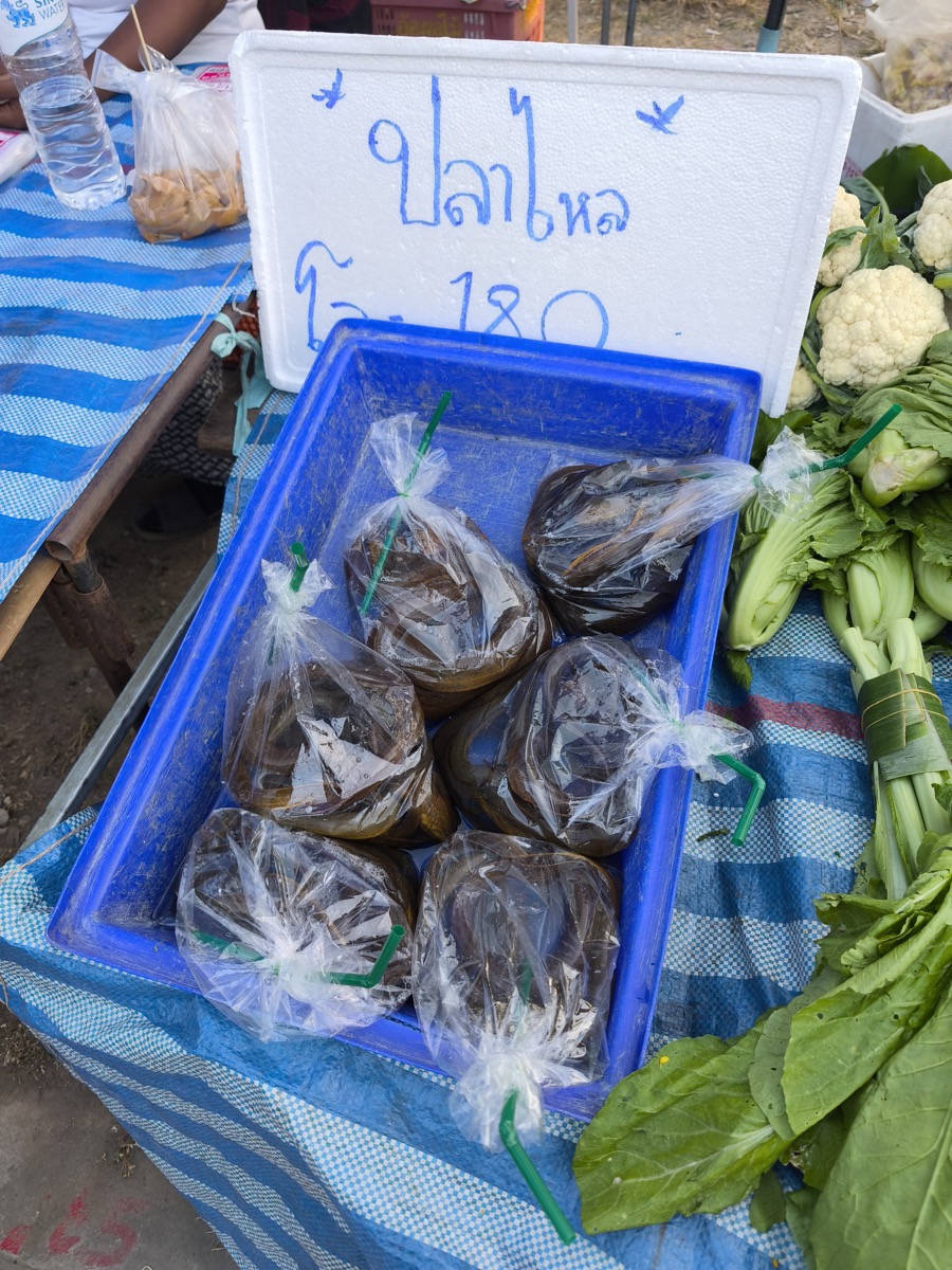 みたことがない魚。川魚だろう。赤いのは市場にあった泡を出すものだ。