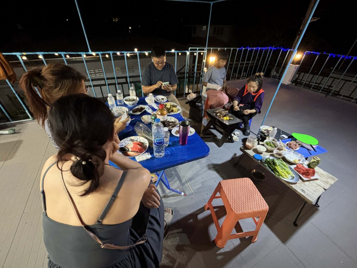 宿、Hatagoの2階はオープンエアでBBQに最適。夕陽もきれいで、空港から離陸する飛行機も見れて良かった(睡眠を邪魔するほどの騒音ではない)。