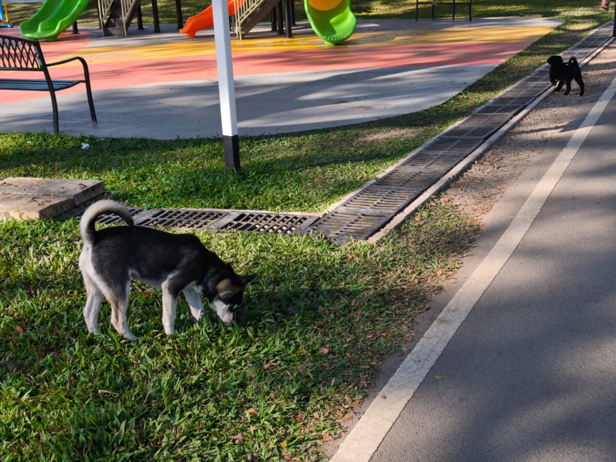 ハスキーと雑種の子供の2頭がノーリードで散歩です。