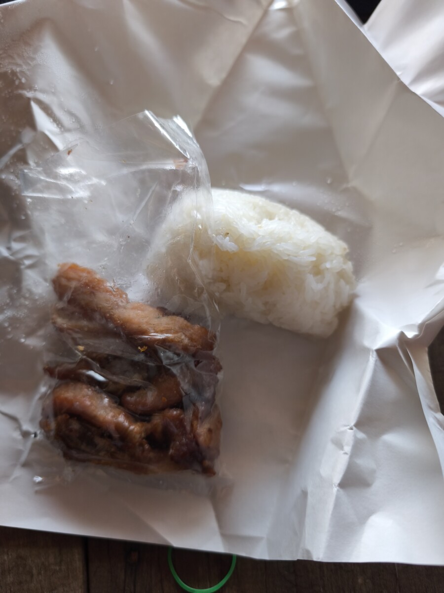 ここで昼食。ふもとで買ったB40のもち米セット。