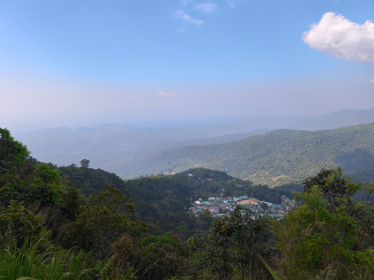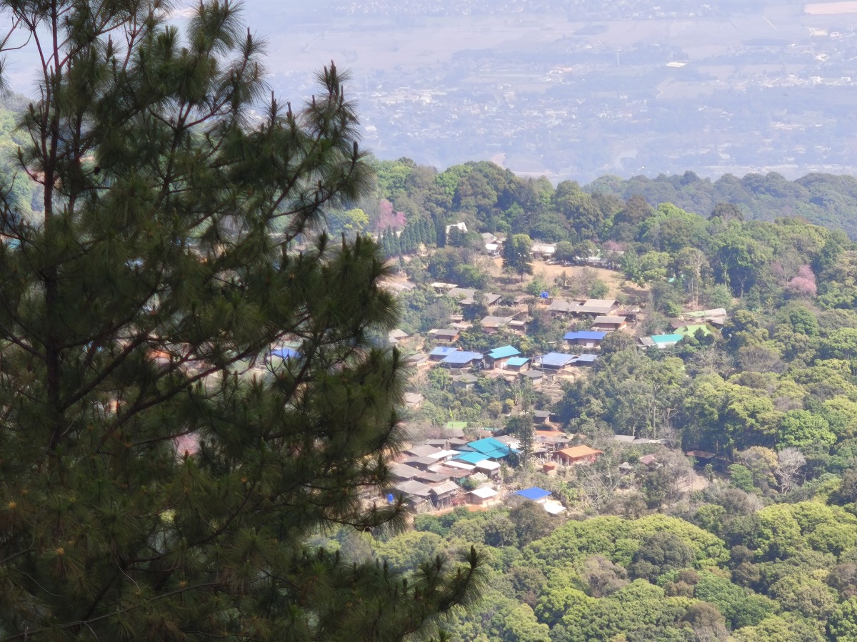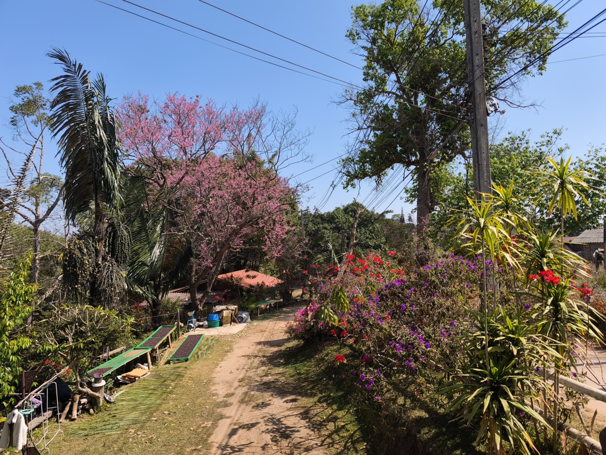 そこから、1時間50分のバイクドライブ。休憩なし。戻ってチェンマイを通り過ぎ、ドイステープを通り過ぎその先にある集落、クンチャーンキィアンというところに。ちょっと1月末は遅いが、桜が見られるらしいということで来てみた。