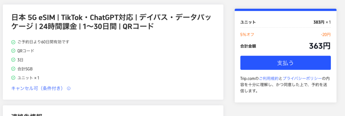 日本の電話契約はPovoでしているけど、そのデータ通信トッピングより、Trip.comで買ったほうが安い。