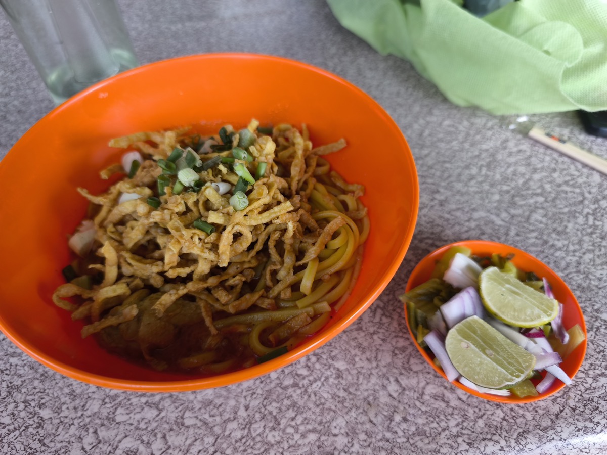 近所の食堂で遅い昼食のカオソーイ。うまい。