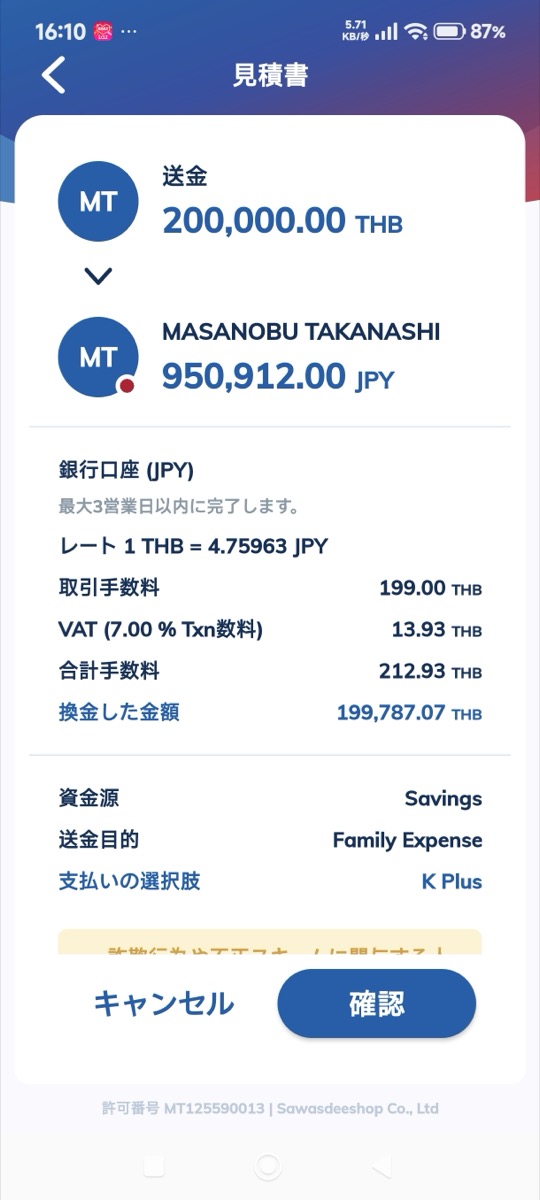 それでタイバーツを日本円にするのが大変。銀行間同士のSWIFT送金だと手数料がけっこう取られる。