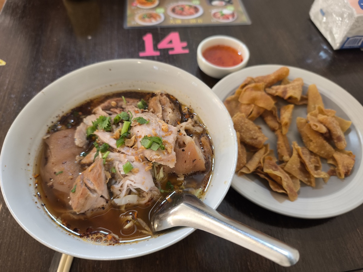 毎週木曜日が定番のお店でトムヤムカムーという料理。カオカームーのライスが麺に変わったもの。